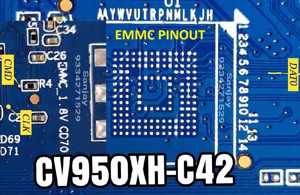 This board has a 4/8GB eMMC chip. you can read the EMMC backup by Pendrive but for writing a backup of EMMC you should jtag the mainboard CV950XH-C42 and write by a programming tool. Be careful while writing emmc backup file, if the board is on standby light due to wrong software or incomplete installation then you can do it, otherwise, it is on standby or red light due to hardware fault. So, first trace the fault. In this case, no need to write emmc backup.