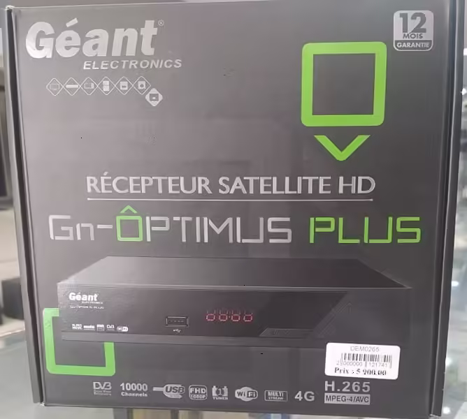 Geant GN-Optimus Plus is a full HD digital satellite receiver. Its Output resolution is 1080P 50 to 60 HZ, 32 BITS. The display screen is a natural on-screen display (OSD) Storage memory: More than 100 satellites that you can download to the device. Multilingual voice. Multilingual DVB subtitle output. Teletext output through OSD screen. Different sets of the favorites list. It can support the locking and editing of the favorite list. Multilingual menu English, French, Russian, Greek, Italian, Arabic, Persian, Ukrainian, Swedish, Spanish, Turkish, and German. Alpha server holder for 2 years. The device carries SERVEUR ALPHA 24 MOIS V. This type opens the French channels v RMC. It can support SPORT CANAL+ BEIN SPORT IPTV DRAGON 12 MOIS Duration.