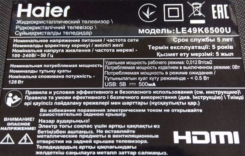 Haier LE49K6500U has multiple input-output interfaces for user connectivity, such as the Number of HDMI connections: 3, the Number of USB ports: 2, No PC input (VGA) Certified, and Other connections: Dual tuner, Common Interface Plus (CI+), WiFi Direct, Ethernet LAN: RJ-45 Digital audio output: (optical), audio L/R-in Headphone output and Service connection.