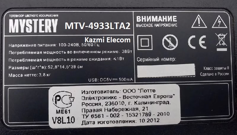 Mystery MTV-4933LTA2 is a 49-inch (124 cm) Full HD Smart Direct LED TV. Its supported screen resolution is 1080 Pixels, 1920×1080. It has the main board (MSA3480), a non-combo board. This LED TV has a powerful sound system with a 16-watt (8×2 watts) stereo speaker system. It has a Worldwide NTSC/PAL/SECAM Color System, DVB-T, PAL BG/PAL I/SECAM BG, DK/ PAL DK TV, DVB-T, DVB-T2, DVB-C, tuners.
