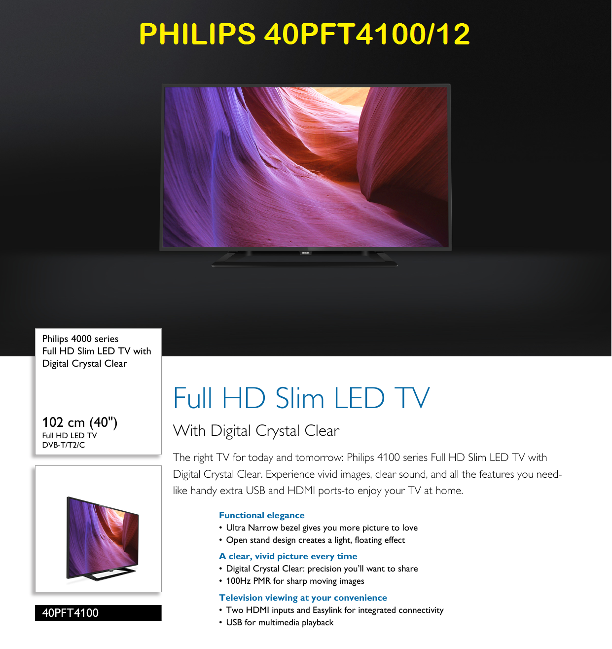 PHILIPS 40PFT4100 is 40 inches (102 cm) 4100 series Full HD digital crystal clear LED TV with a supported resolution of 1920×1080 (1080 P). PHILIPS_40PFT4100/12 FHD ultra Slim LED TV with tuner (DVB-T/T2) technology. It has multiple input interface ports like HDMI, USB, and AV. It has a Built-in DVD player (NTSC, PAL). PHILIPS-40PFT4100/12 is DVB-T/T2/C transmission functions.