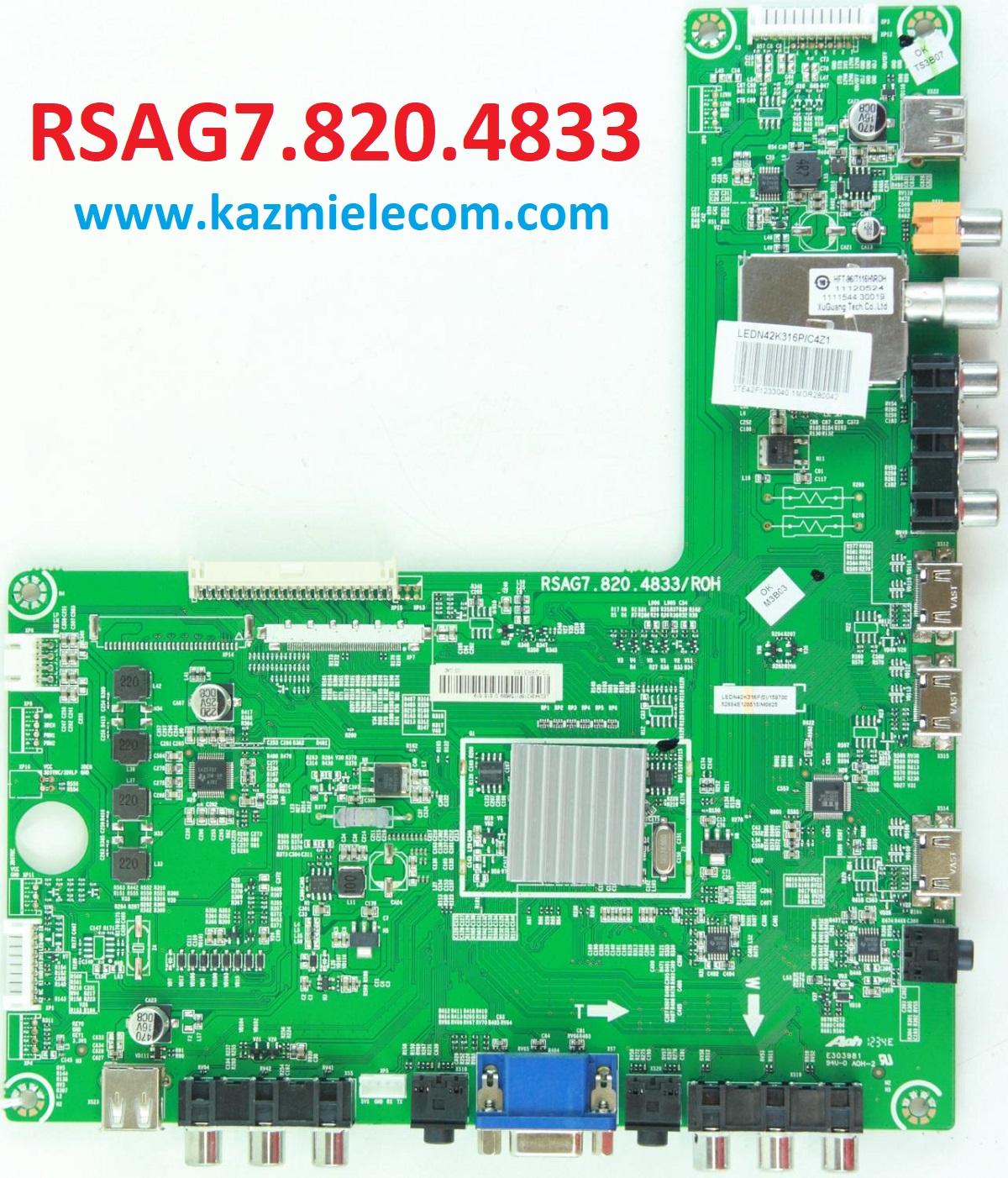 RSAG7.820.4833 is a simple ATV Driver Motherboard designed for LCD/LED TVs. This board is suitable for the Asia Pacific and the Middle East markets. It is designed to support Full HD LCD/LED Panel Screens. This is a Non-Combo Board. The main power module and LED Backlight Inverter Circuit module are required separatley but ATV Card is builtin into this motherboard. This board has all the features and connectivity ports as per the latest requirements like HDMI input, USB interface, PC input, Component Input, TV, and Scart. Its USB interface can be used for updating software/firmware and for playing multimedia files as well. It can also support Earphone output. RSAG7.820.4833 firmware files are given below for the technician’s support.