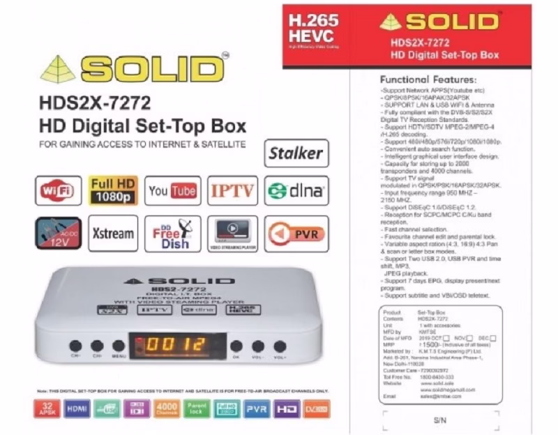 SOLID HDS2-7272 is an HD digital Set-Top Box with a Full HD 1080P supported display format. It can support a Wi-Fi adapter with USB ports. It is Fully compliant with DVB-S2 Reception standards. It can support Network APPs and Internet Streaming Links. It can support DVB-S/S2 Digital TV signal modulated in QPSK/8PSK.