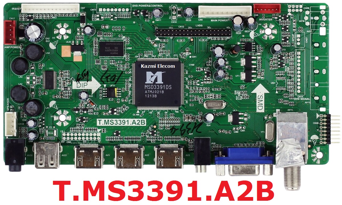 T.MS3391.A2B is a simple ATV Driver Motherboard designed for LCD/LED TVs. This board is suitable for the Asia Pacific and the Middle East markets. This is a Non-Combo Board. The main power module and LED Backlight Inverter Circuit module are required seperatley but ATV Card is builtin into this motherboard.