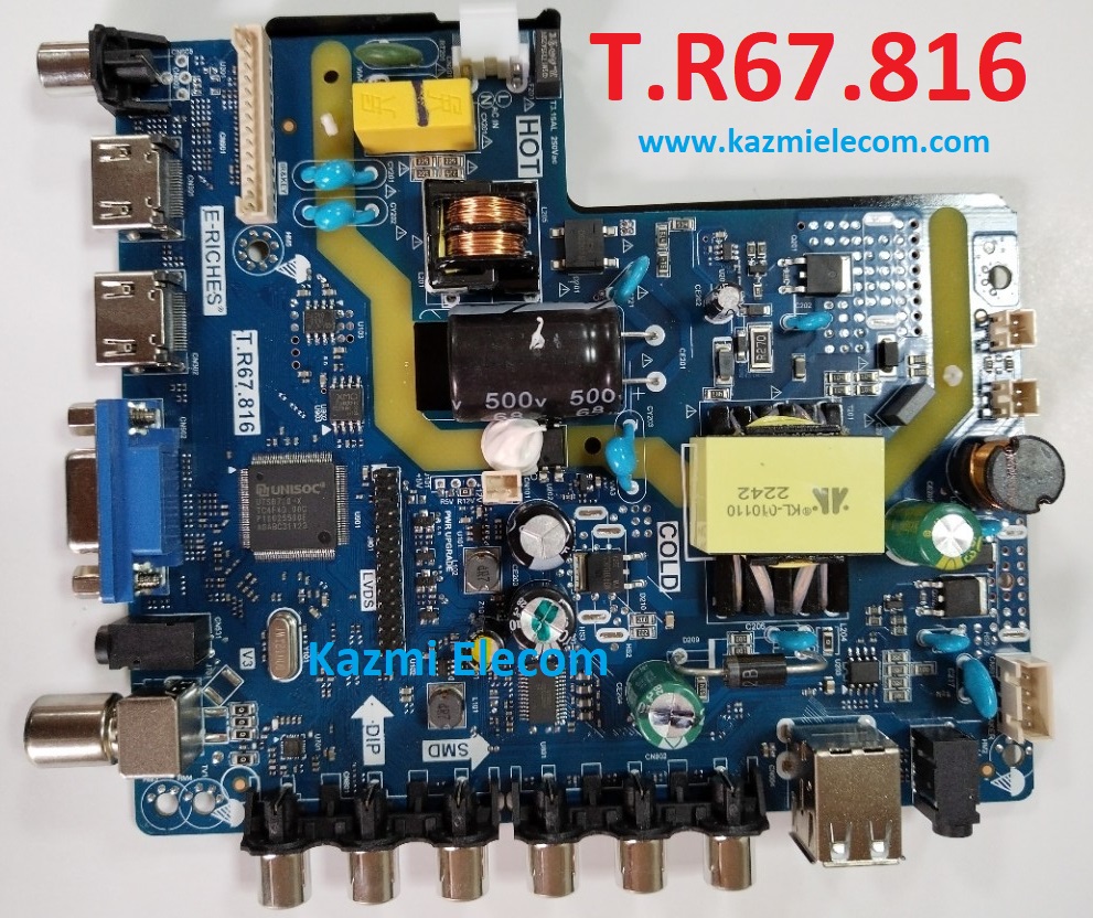 T.R67.816 is a simple ATV Driver Motherboard designed for LCD/LED TVs. It is designed to support Full HD LCD/LED Panel Screens. This board is suitable for the Asia Pacific and the Middle East markets. This is a three-in-one Combo Board. The main power module LED Backlight Inverter Circuit module and ATV Card are built into this motherboard. This board has all the features and connectivity ports as per the latest user requirements like HDMI input, USB interface, PC input, Component Input, TV, and Scart.