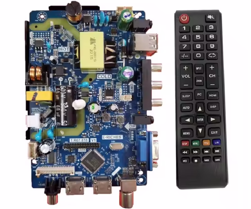 T.R67.818 is a simple ATV Driver Motherboard designed for LCD/LED TVs. It is designed to support 32-inch to 39-inch HD and Full HD LCD LED Panel Screens. This board is suitable for the Asia Pacific and the Middle East markets. This is a three-in-one Combo Board. The main power module, LED Backlight Inverter Circuit module, and ATV Card are built into a single piece of motherboard (PCB).
