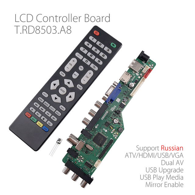 T-RD8503-A8 is compatible with 10-32 inch screens. A8 is wide-screen supported and also has multi-language option. T_RD8503_A8 has its special feature of Dual AV. ZSY-T.RD8503.A8 is also an Analog LCD-LED Universal TV Driver Card TV / PC / VGA / HDMI Driver / Dual USB Interface AV EM Russian USB Play Media.