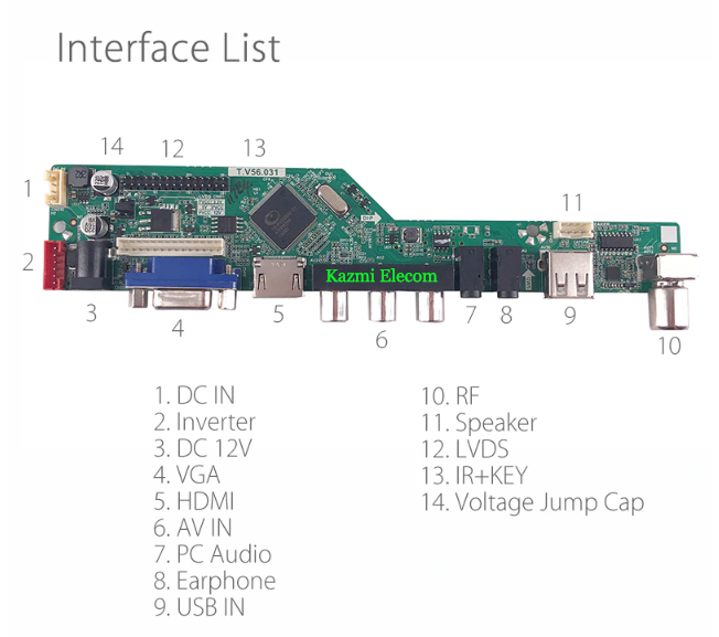 T.V56.031 is a universal LCD/LED TV Controller board that is designed for Asian countries and supports the Russian menu language as well. T_V_56_031 supports a high screen resolution of 1920×1080 panels. T.V56.031 is compatible with 7-55″ LVDS screens but does not support all panels.