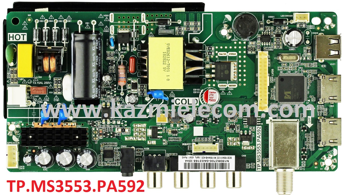 TP.MS3553.PA592 is a simple ATV Driver Motherboard designed for LCD/LED TVs. This board is suitable for the Asia Pacific and the Middle East markets. This is a Combo Board. The main power module and LED Backlight Inverter Circuit module and ATV Card are builtin into this motherboard.