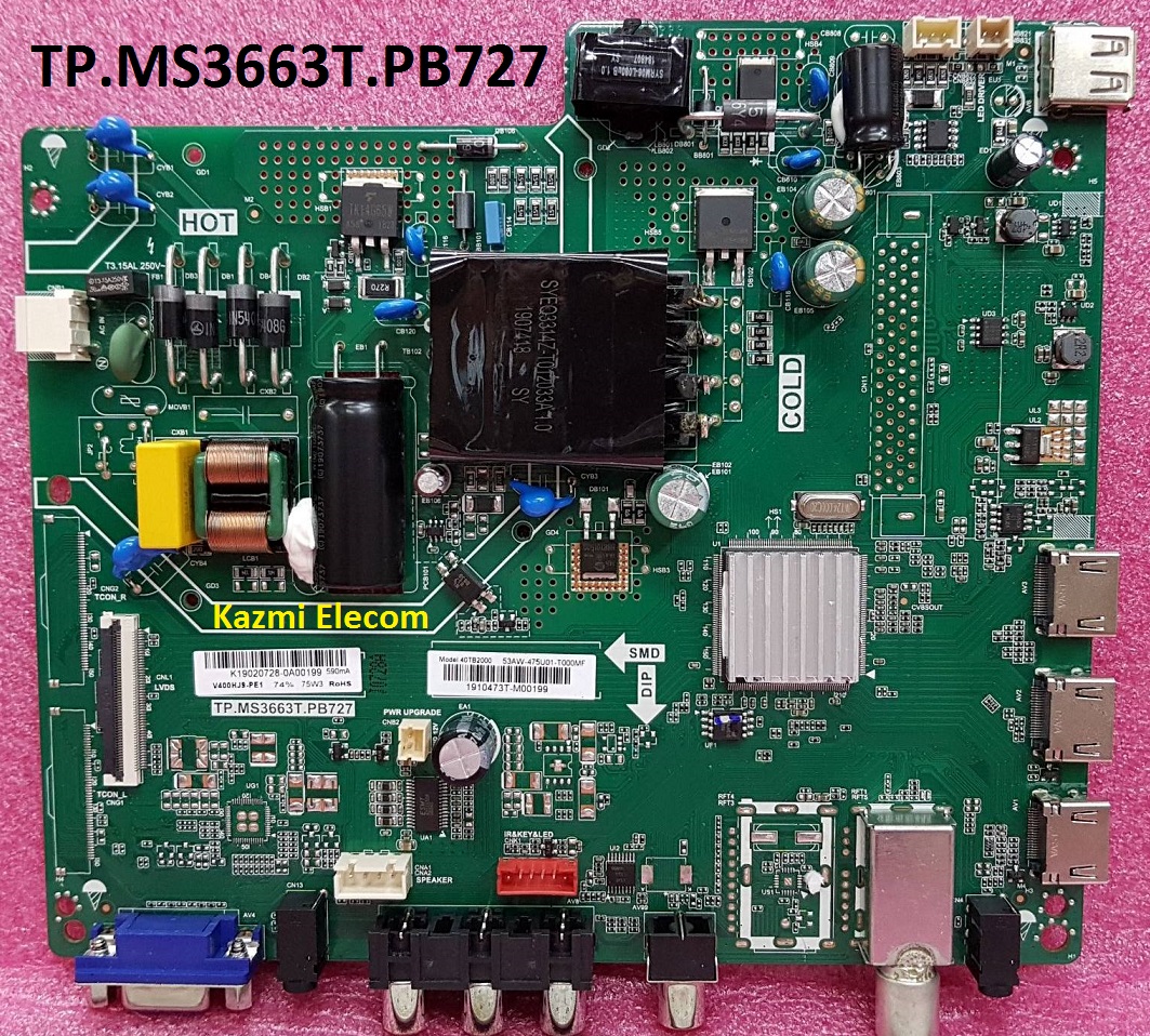 TP.MS3663T.PB727 is a simple ATV Driver Motherboard designed for LCD/LED TVs. This board is suitable for the Asia Pacific and the Middle East markets. This is a Combo Board. The main power module and LED Backlight Inverter Circuit module and ATV Card are builtin into this motherboard.