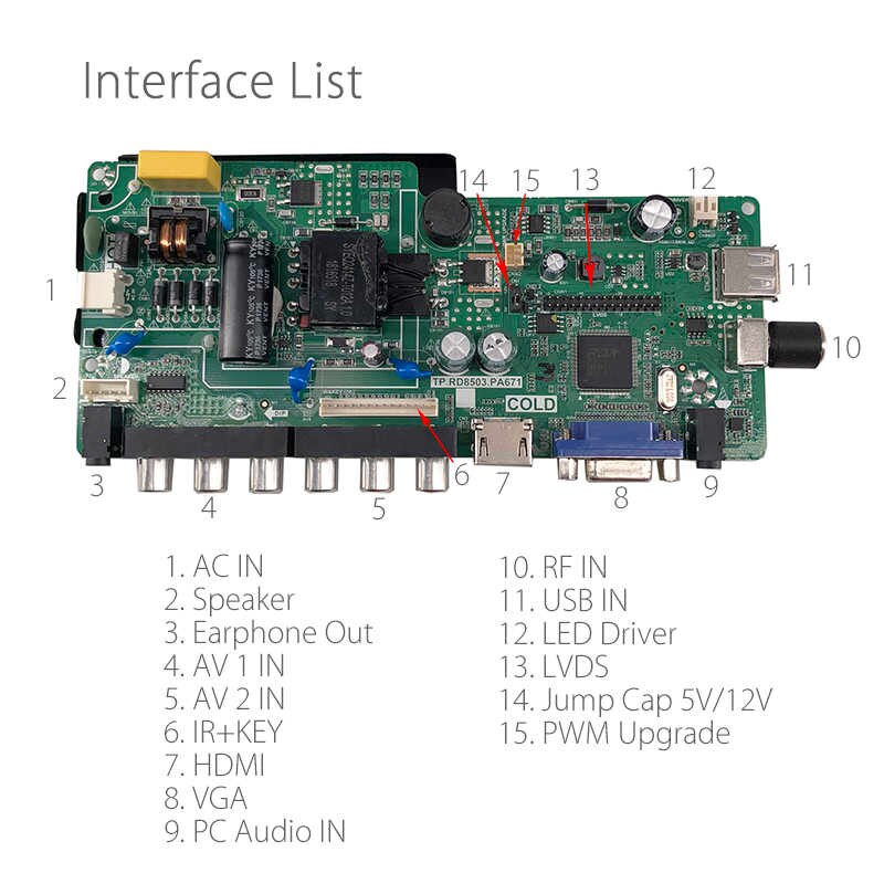 TP.RD8503.PA671 HD three in one LCD Driver Card LED Display Screen TV Card with Dual AV. TP-RD8503-PA671 can support up to 1920×1200 screen panel resolution. The USB interface can be used for Firmware Upgrade and Multimedia Playback.