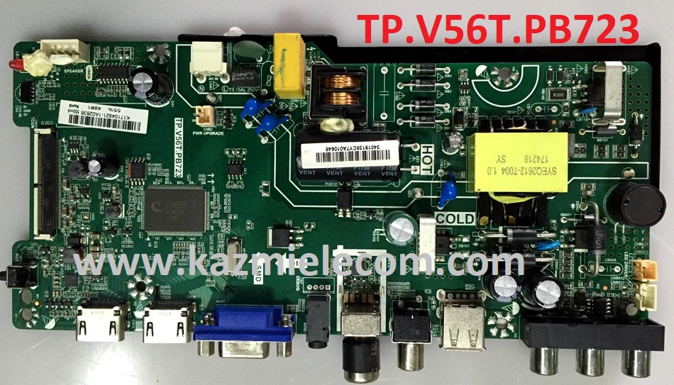 TP.V56T.PB723 is a simple ATV Driver Motherboard designed for LCD/LED TVs. This board is suitable for the Asia Pacific and the Middle East markets. This is a Combo Board. The main power module, LED Backlight Inverter Circuit module, and ATV Card are built into this motherboard.