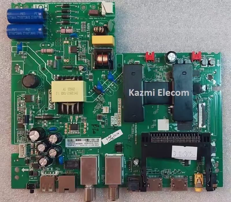 TPD.RT2841.PB775 is a smart Android FHD motherboard for LCD and LED TVs. Its maximum supported screen resolution is 1920×1080 Full High Definition 1080 Pixels. This is a Combo three-in-one motherboard that is built with the main power input circuit and the backlight inverter driver circuit with a cable TV tuner on a single piece of printed circuit board (PCB). This board has 8GB of storage NAND Flash memory (EMMC). Its processing speed is very fast, and its response time is excellent. The graphics quality is awesome, and the sound quality is very good with a dual stereo speaker system of 16 watts (8*2).